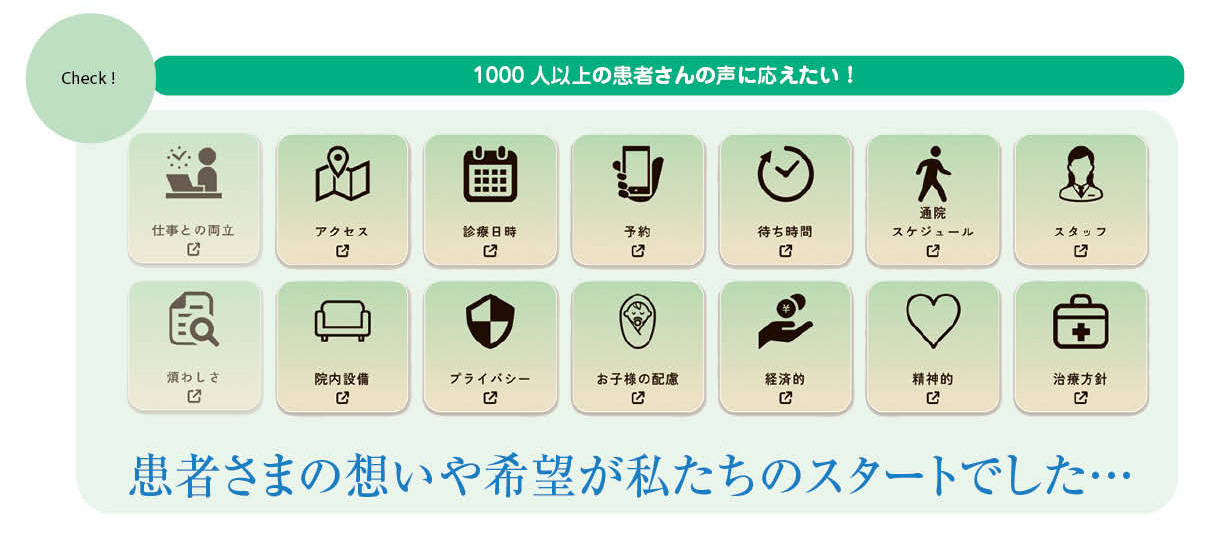 私たちは、開院に向けて患者さまの声を聴き、その想いに寄り添うべく、1000人以上の治療経験者からご意見をお聞きしました。