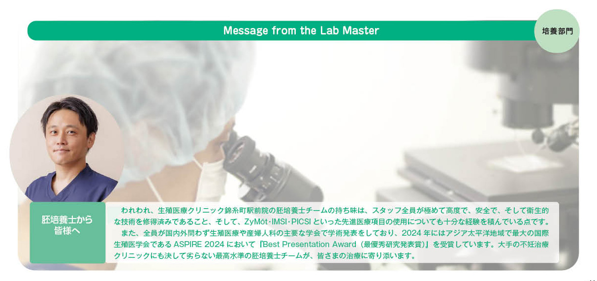 われわれ、生殖医療クリニック錦糸町駅前院の胚培養士チームの持ち味は、スタッフ全員が極めて高度で、安全で、そして衛生的な技術を修得済みであること、そして、ZyMōt・IMSI・PICSIといった先進医療項目の使用についても十分な経験を積んでいる点です。