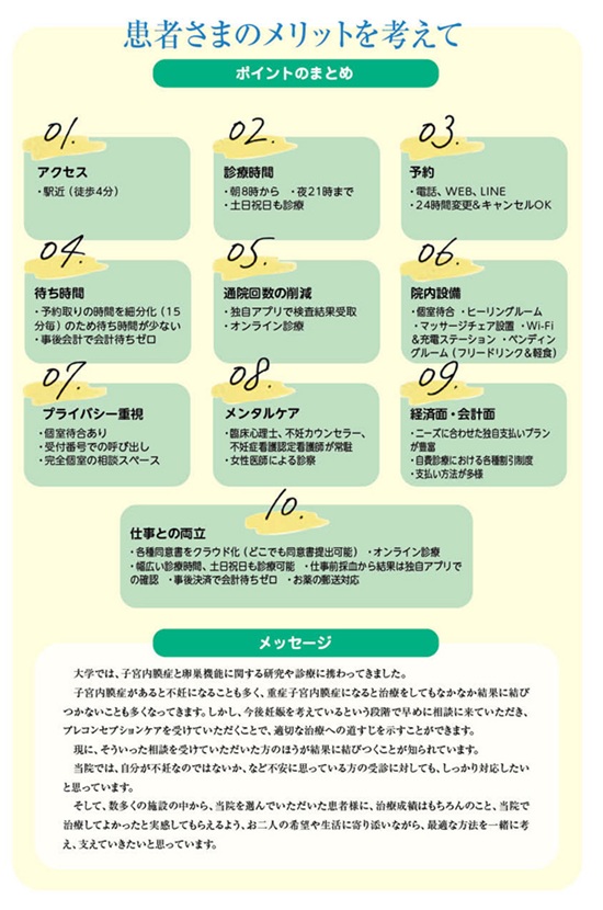 開院にあたり、患者さまの声を十分に分析しスタッフで話し合いました。そして、患者さまにとってどのような不妊治療・生殖医療院が必要なのか、どうしたらもっと患者さまにメリットのある治療が具現化できるのか、具体的に10項目のポイントを挙げました。