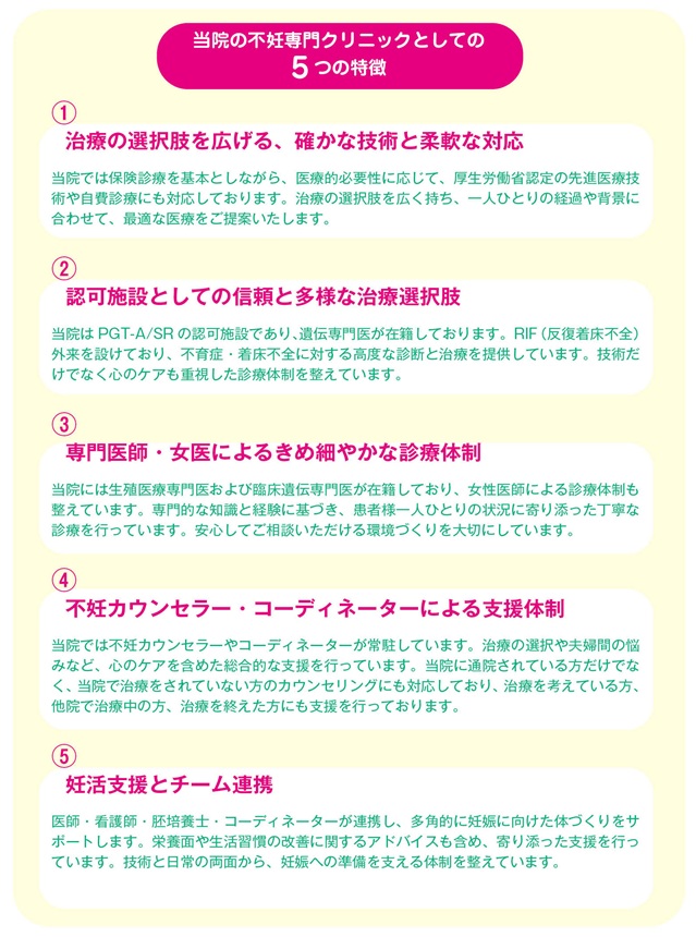 それぞれのご夫婦の経過や背景に合わせた治療法と、きめ細やかなケアを通して、小さな命の輝きが確かな未来へと続くよう、お手伝いできればと願い、日々の診療に向き合っています。